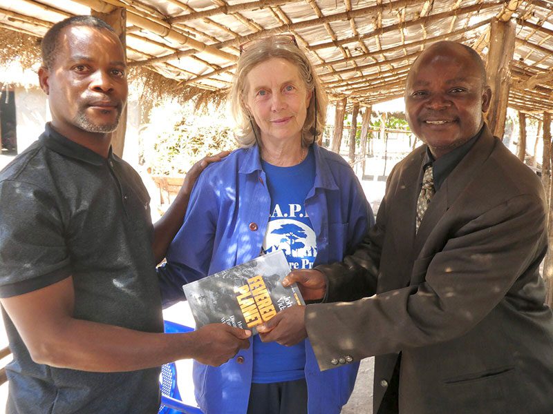 A memorial ceremony in honour of John Vidal was held at Gumbi (see picture below of Patrick, Jen Vidal and the Gumbi Chief), where Jen presented a copy of John’s book to be kept in the village Library – sadly the library had lost its roof, but that has now been re-roofed. At Gumbi we also met Kennedy (see picture below), keeping the connection with the man who had inspired John’s original article.